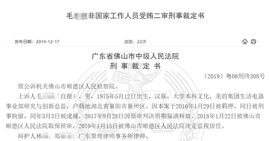 新浪财经讯 近日,裁判文书网一则受贿案刑事判决书显示,年薪近百万的原美的集团智慧家居研究院院长因受贿7万元被判处有期徒刑1年。而该名